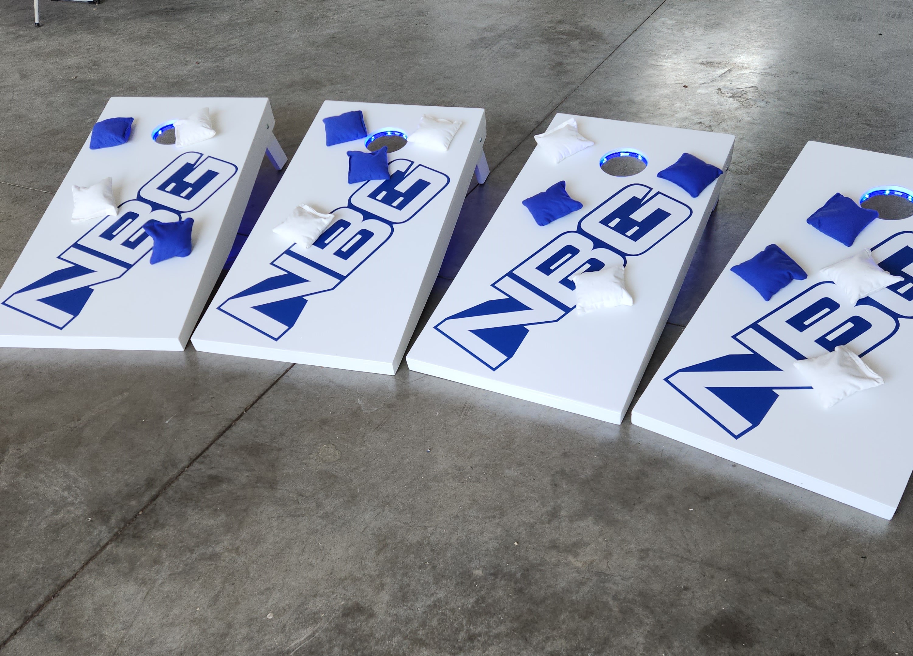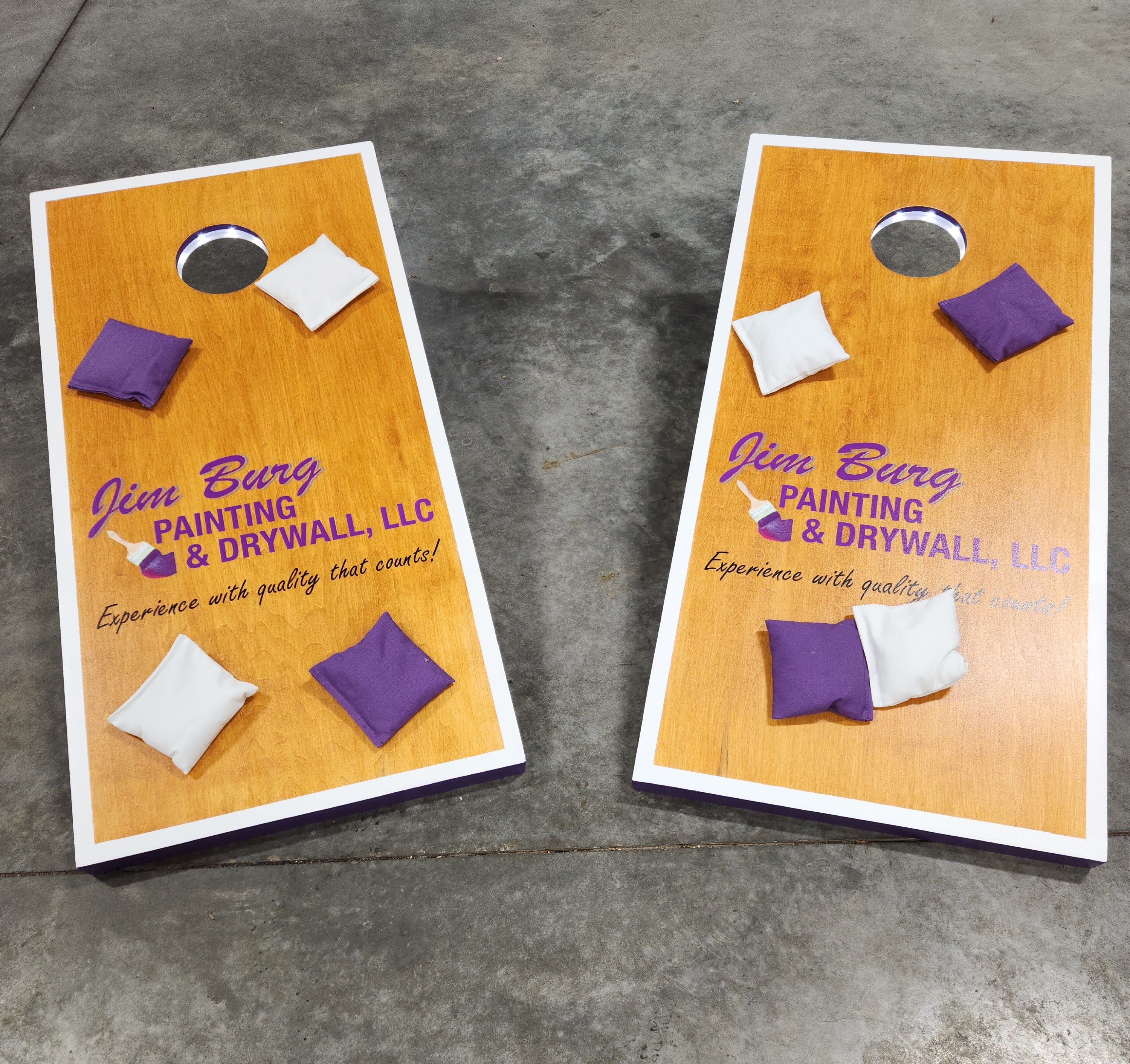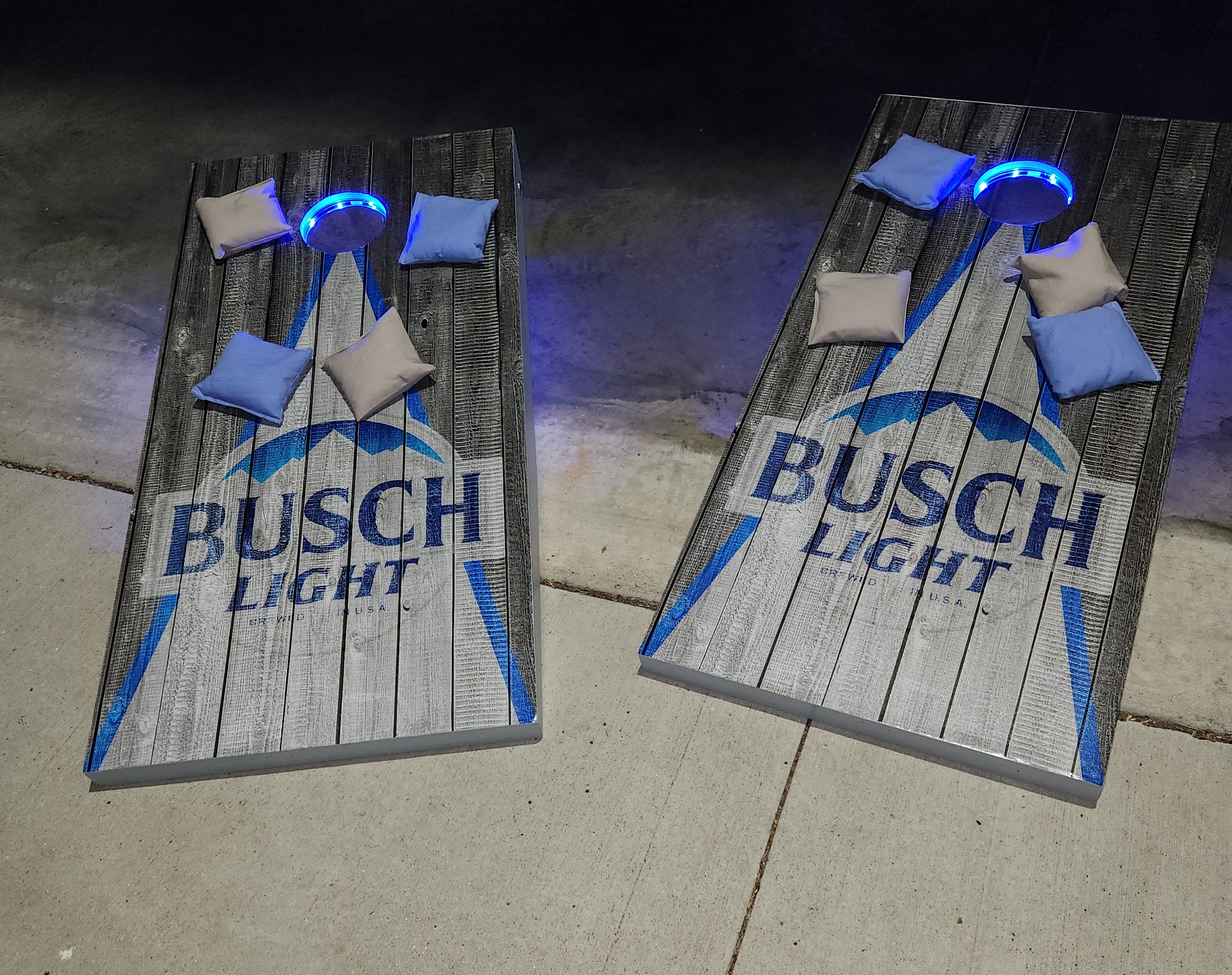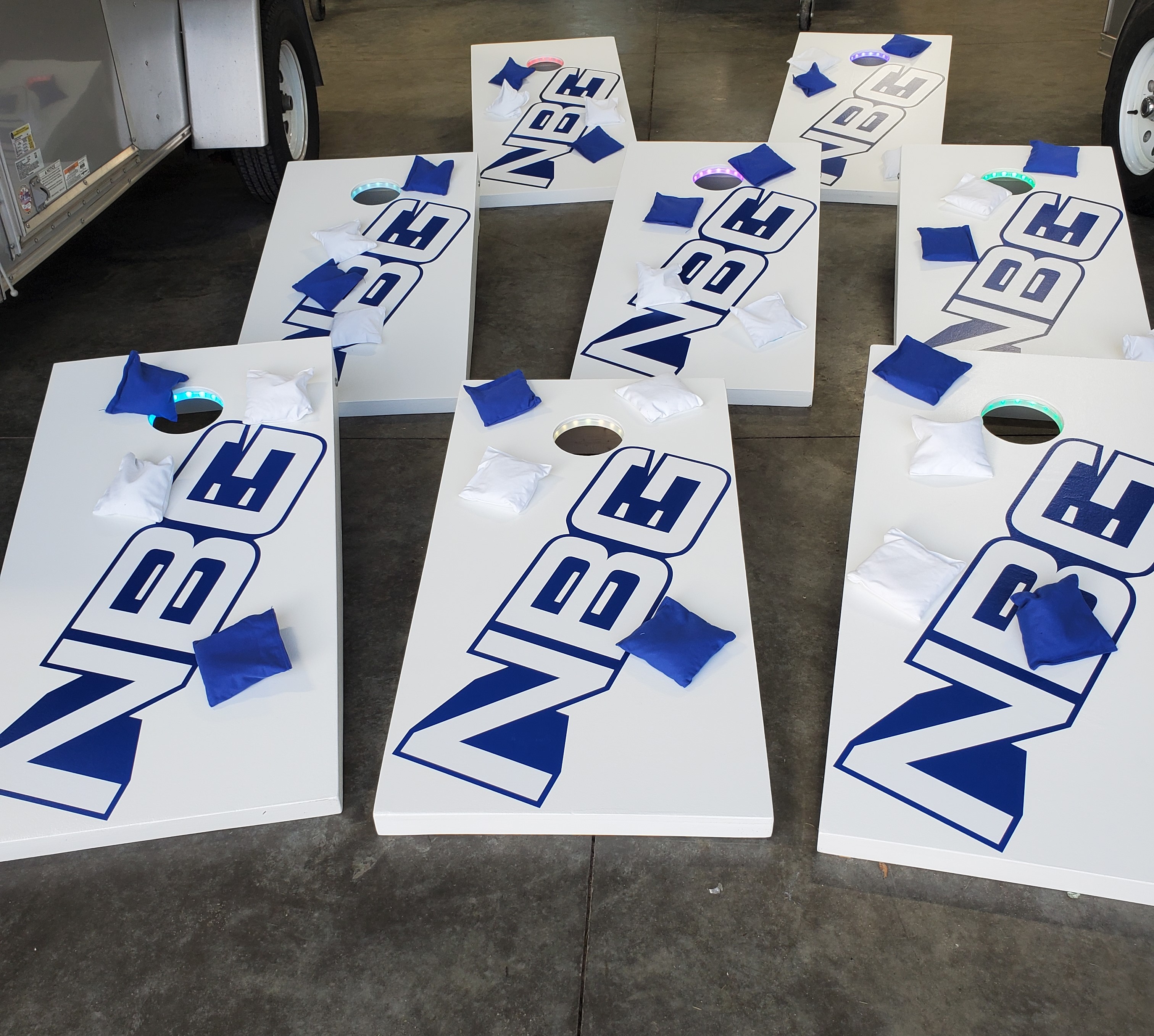 Since the introduction of our Games trailer and the use of the CornHole games we built, there have been several requests to build CornHole Games for others. We have built more and will take orders for Custom sets. Pricing varies based on cost of materials at the time of orders. We can hand paint, use decals, wraps or other graphics. Lights and bags can be ordered as well. Here are some pictures of previous sets. Some with lights